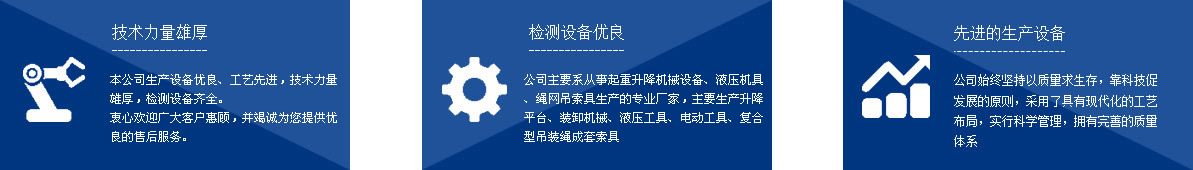 本公司系從事起重升降機(jī)械設(shè)備、液壓機(jī)具、繩網(wǎng)吊索具生產(chǎn)的專業(yè)廠家,主要生產(chǎn)千斤頂、液壓拉馬、軸承加熱器、升降平臺(tái)、裝卸機(jī)械、液壓工具、電動(dòng)工具、復(fù)合型吊裝繩成套索具、高強(qiáng)纖維柔性吊裝帶、起重鏈條成套索具、橫梁吊具、注塑繩、軟梯、安全帶、安全網(wǎng)等幾大系列、上百種規(guī)格的產(chǎn)品,廣泛應(yīng)用于電力、油田、大型鋼廠、機(jī)電、化工、航空、冶金、機(jī)械、鐵道、造紙、港口、建筑等領(lǐng)域。